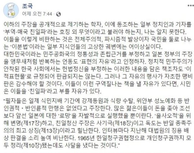 정부 비난하면 친일파 조국 페이스북에 또 갈등 조장 글 Save Internet 뉴데일리
