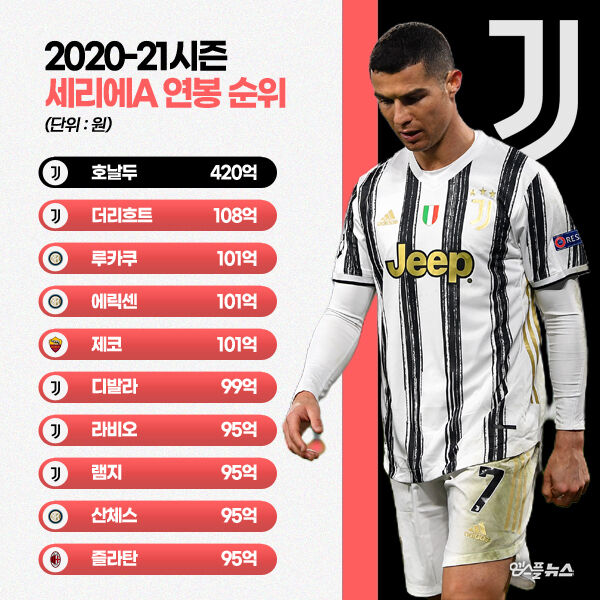 한편 유벤투스는 호날두에 연봉 3000만 유로약 407억원으로 팀 내 2위 디발라보다 두 배 이상 많은 금액이다.