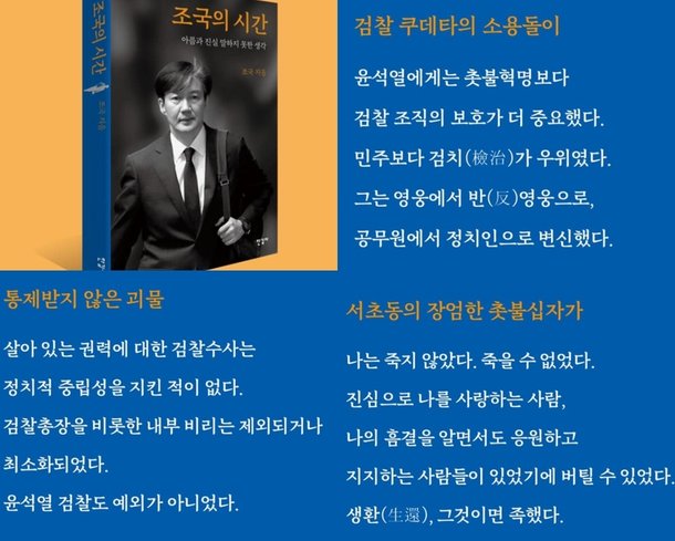 조국 가족과 우리의 일상의 소소한 행복이 온전히 회복되기를. 한 자씩 새기며 읽겠다. 여당이 조국의 시간 앞에서 머뭇대는 사이 보수세력은 역대급 세대교체를 일거에 단행했다.