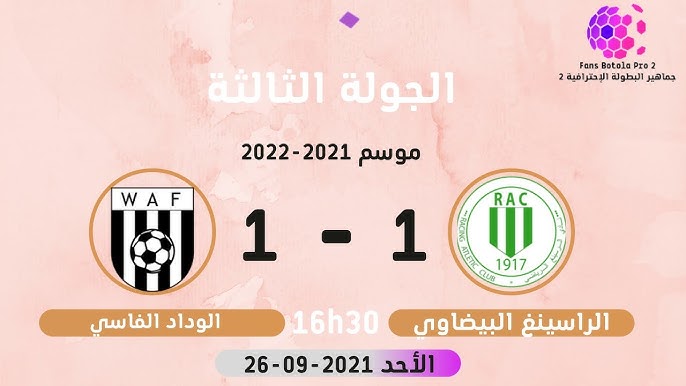 مباراة الوداد الرياضي ضد الراسينغ البيضاوي- wac vs rac. شباب أطلس خنيفرة ضد الوداد الفاسي. أما في المقابلة الثالثة فقد انتهت بدورها بالتعادل بهدف لمثله بين الراسينغ البيضاوي والوداد الفاسي ويشغل الراك المرتبة الرابعة بخمس نقاط مقابل تواجد الواف في المركز الثامن بأربع نقاط.